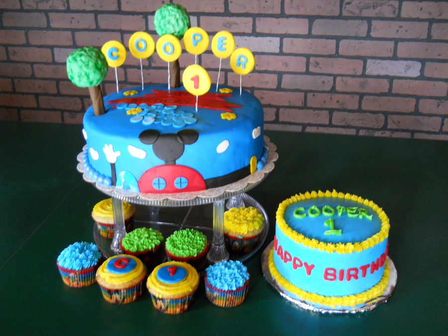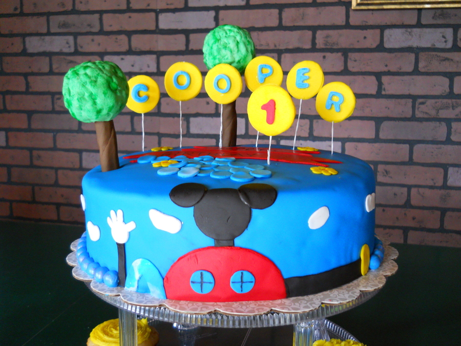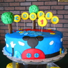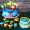 Fondant covered funfetti cake. Fondant covered rice krispy treat trees. Fondant yellow balloons.