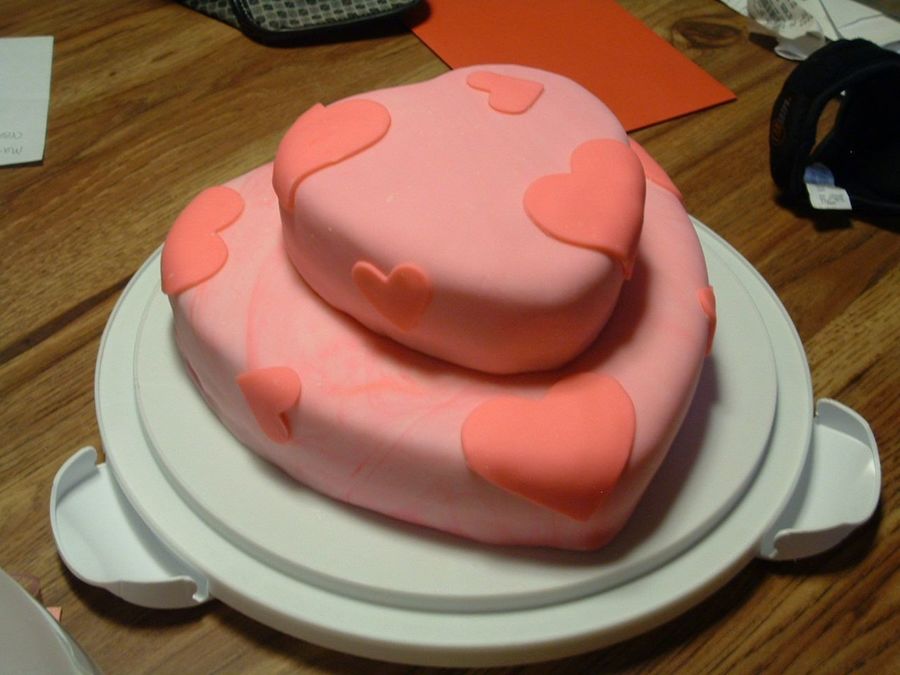 The cake is Yellow Butter Cake with Vanilla Flavored Buttercream Icing covered in Fondant and little Fondant hearts.