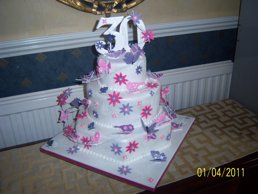My friend loves butterflies and asked me to do a cake for her 30th birthday. I made run out butterflies in royal icing and stuck them on some wire going round the cake. She loved it.