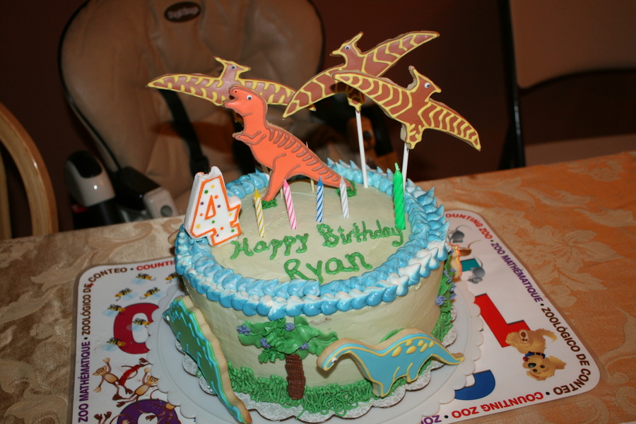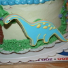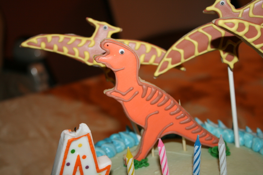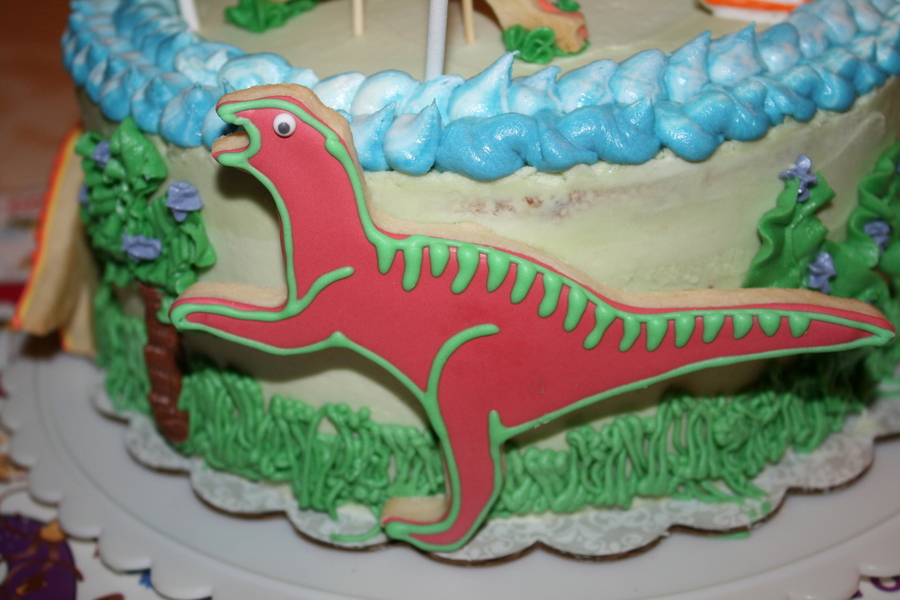Chocolate chip cake filled with cookie dough and Bettercream. Covered with vanilla frosting and sugar cookies with royal icing details.