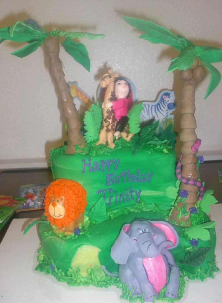 Chocolate cake peanut butter buttercream covered in fondant. Giraffe, girl, snake and lizard are all gumpaste. The lion and elephant are rkt covered in fondant. Trees and plants are gumpaste. Grass and flowers are buttercream.