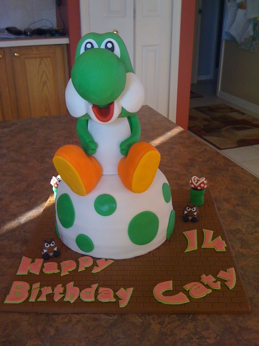 Yoshi is make of RKT covered in fondant and egg is yellow cake covered in fondant.