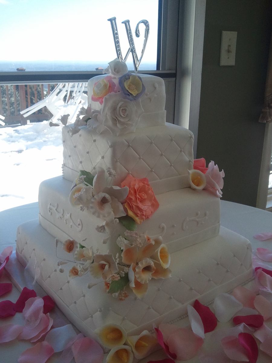 I made this cake for a good friend of mine. Four square tiers! Fondant cover. Bottom tier was 2 layers vanilla cake/vanilla buttercream...Next tier was 2 layers dark chocolate cake/milk chocolate buttercream...next tier up was 4 layers alternating pistachio and almond cake with almond buttercream and the top tier was pistachio cake with banana buttercream!