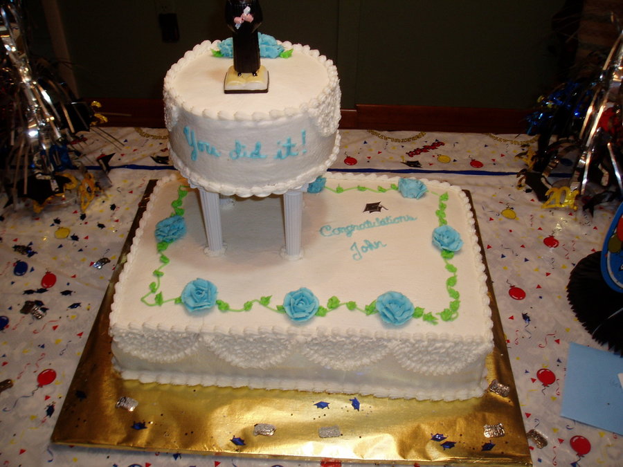 I made this cake for my nephew's graduation from college. Two layer 12x18 sheet with 8 inch round. Frosted in buttercream with buttercream roses .