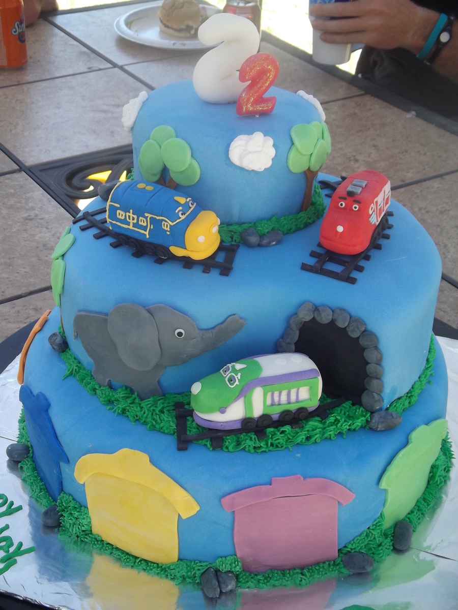 Here is a chuggington cake that I made this weekend for my sons 2nd birthday!( I got inspiration from a Thomas cake by lilo-taart) Made the trains out of fondant. Was WAY happy with how it came out! TFL!!