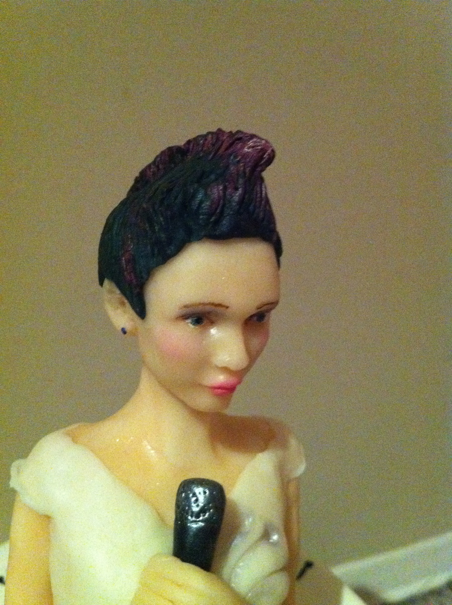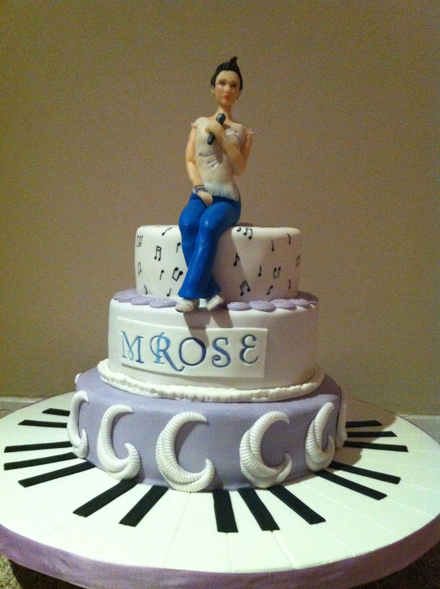 This is my first donation through Icing Smiles (Icing Smiles Inc organizes cake donations between volunteer bakers and families with a child having a critical illness) My girl is MRose who is a singer, loves music, and the color purple. Girl on top 11" tall sculpted out of modeling chocolate.