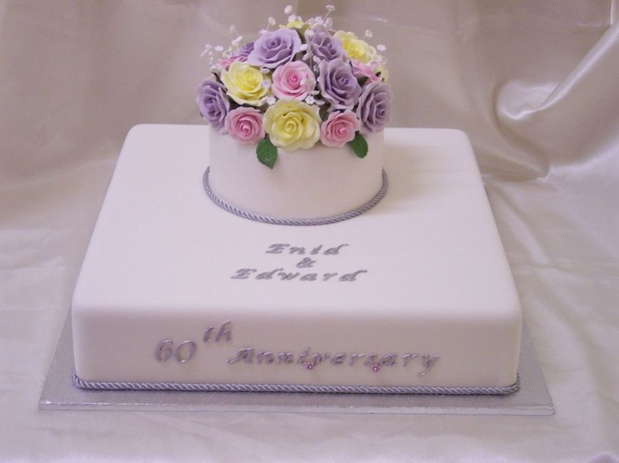 14 inch square with 6 inch round top. Both white chocolate mud cake covered in fondx. All roses, fillers and lettering are gumpaste. All comments, suggestions and feedback welcome.