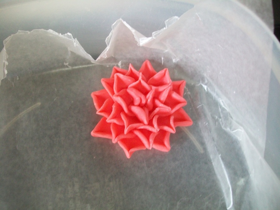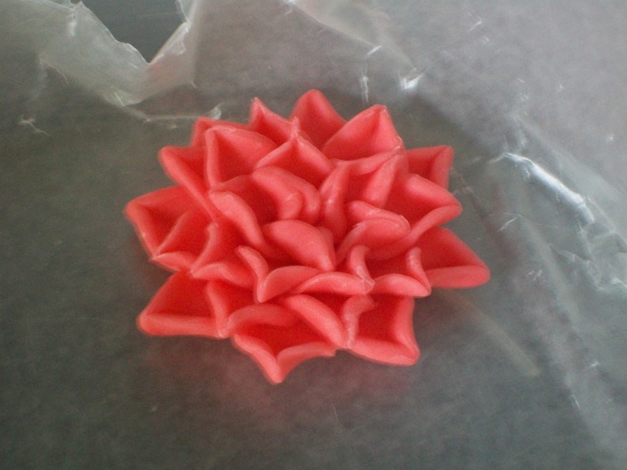 Practicing the dahlia as seen on so many of the beautiful cakes on this site. Used this solo flower on a dark chocolate mint cake. Of course, I forgot to take a photo of the cake before we served it.