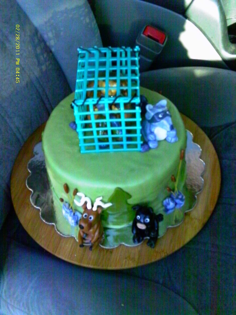 had a request for a "coon" cake and so we kinda did a spoof with it and instead of trapping the coon we trapped the hunter...there is a big comfoy chair with beer inside trap...was a big hit...