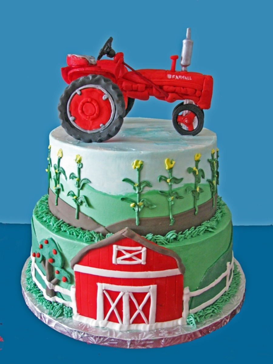Clients son was turning 21 and loves Farmall tractors. She sent me pics of one of his models so I did my best to duplicate it in fondant/gumpaste. Was a lot tougher than I anticipated! She gave me liberty to decorate it, so thanks to many ccer's for inspiration. TFL!