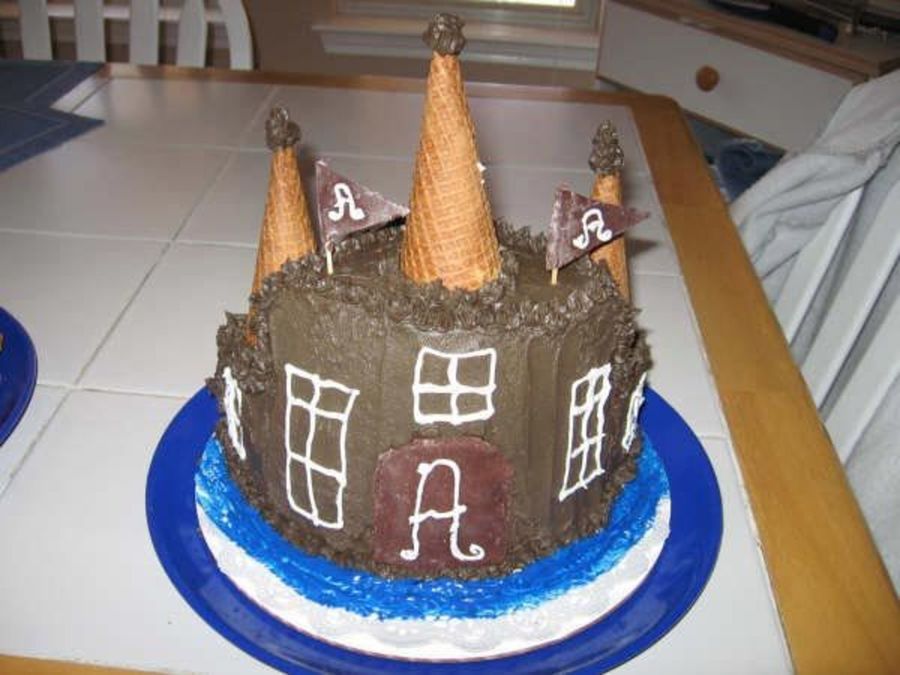 This is a small castle for my niece's birthday. It's one layer cut in half and then a half round cut into quarters. The icing is chocolate--my niece doesn't like "girly" things and wanted a real castle color..........
