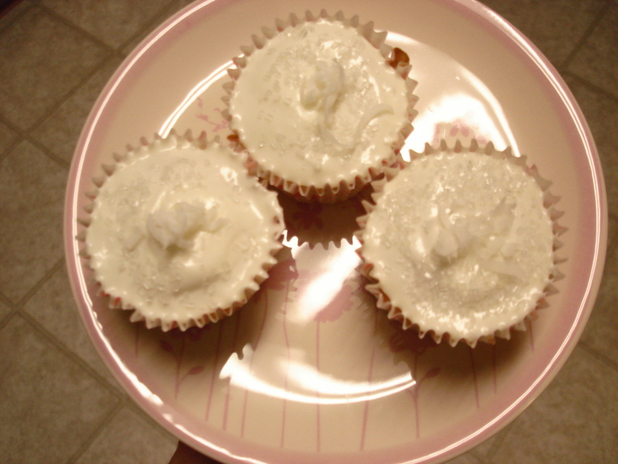 not a great picture, but these where white chocolate coconut cupcakes for a cupcake party here in town. Purple sprinkles with white buttercream topped with coconut flakes.