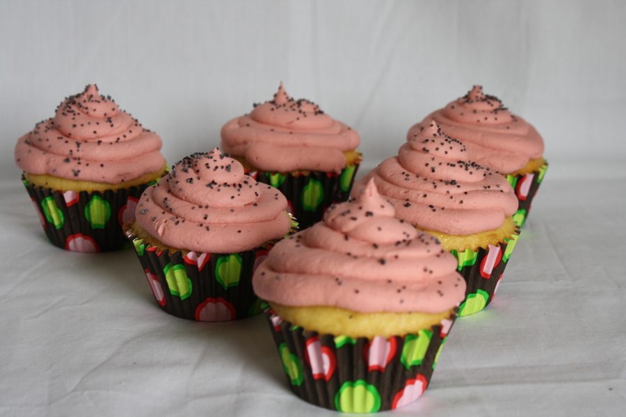 Lemon cupcakes filled with Lemon curd. Iced with a Raspberry Cream Cheese SMBC and garnished with Poppy Seeds!