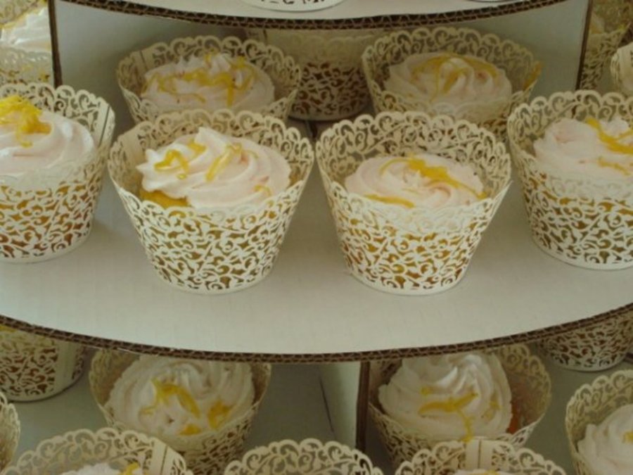 Lemon Cake, Raspberry Purree and White Chocolate Mousse Filling, Buttercream frosting. Lemon Zest Curls for garnish.