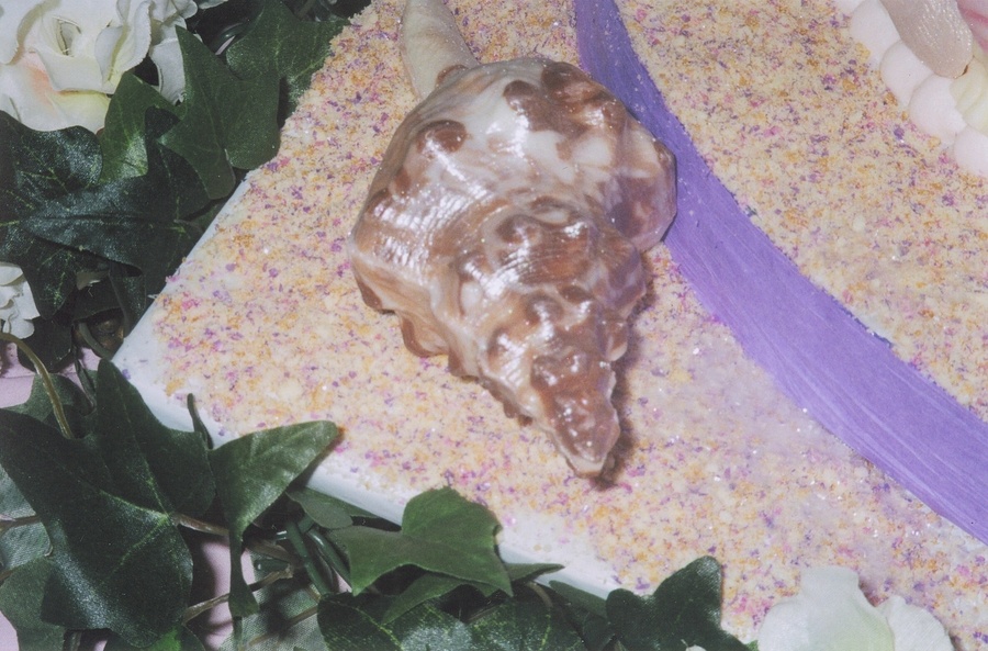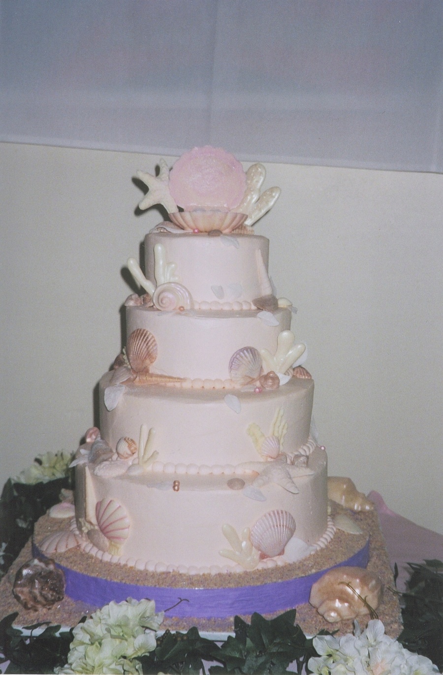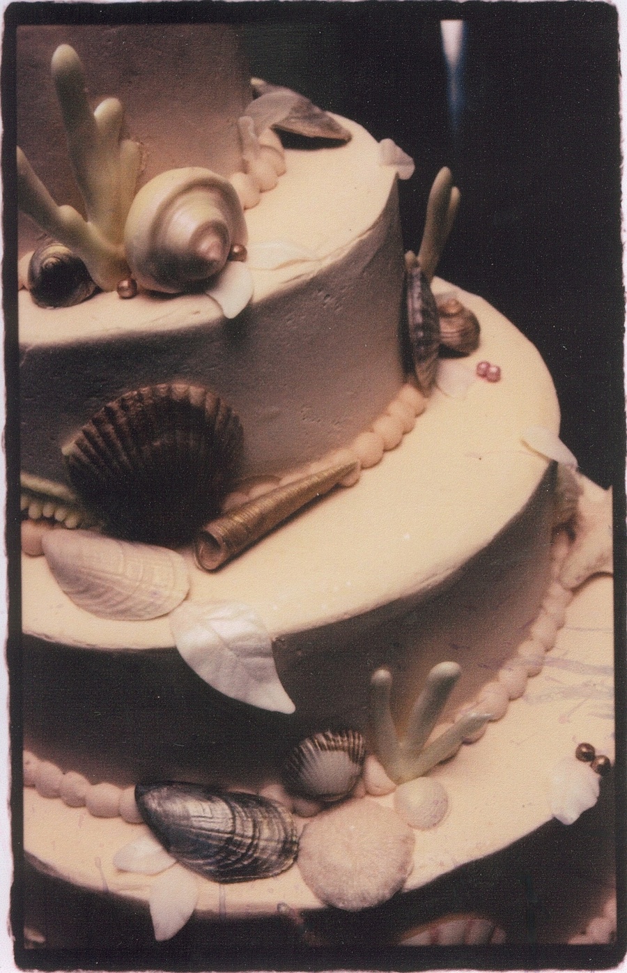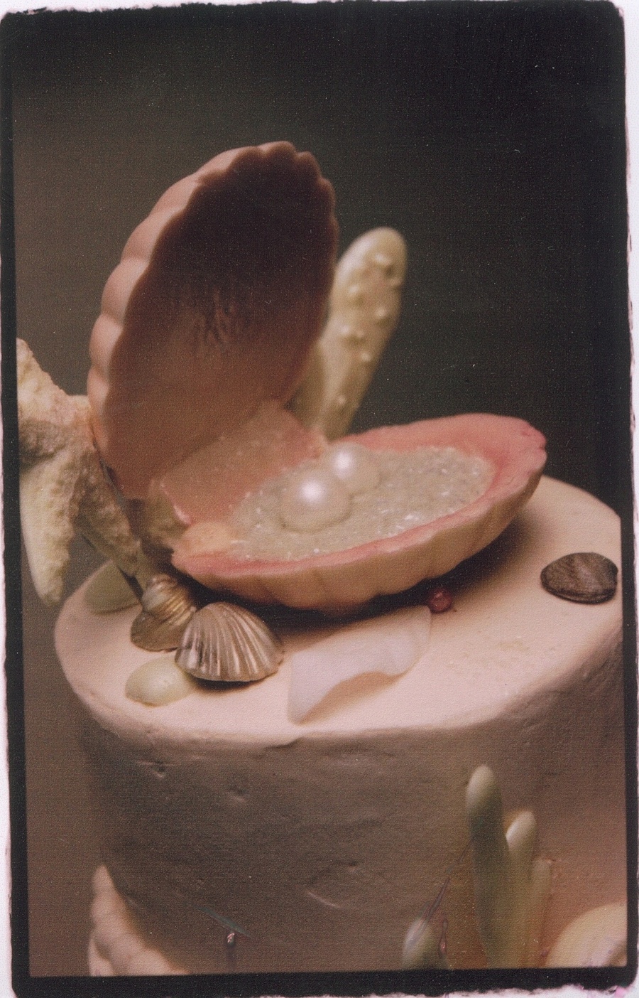 The shells andcoral are all made of chocolate & dusted with lustre dust. The sand is crushed vanilla wafers