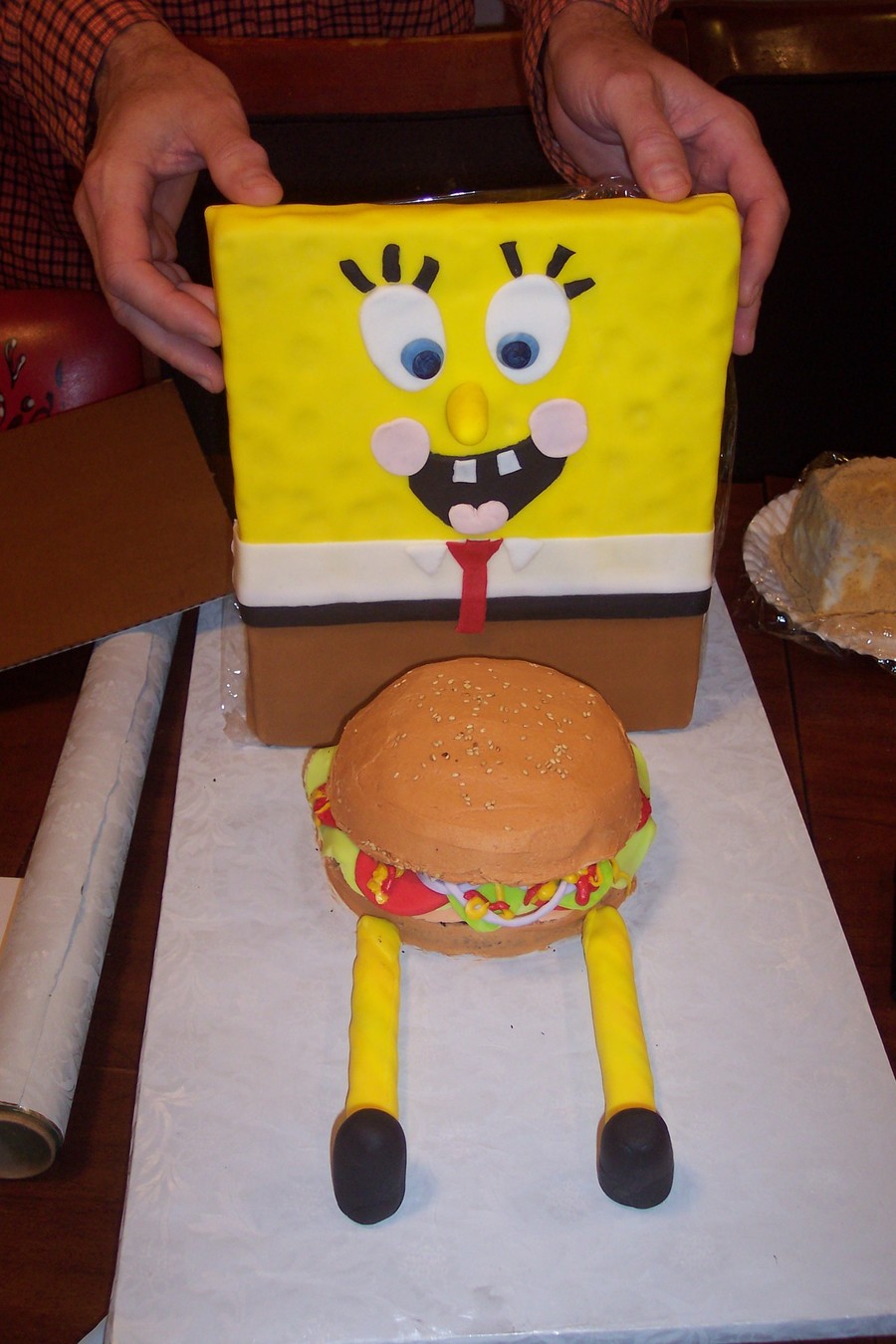 Spongebob made out Rice krispy Treats. The crabby patty was butter cream and fondant accents. I wanted to get a picture before I had to pack it up so DH is holding it up and I already packed the arms so this is the only picture I got before they picked it up