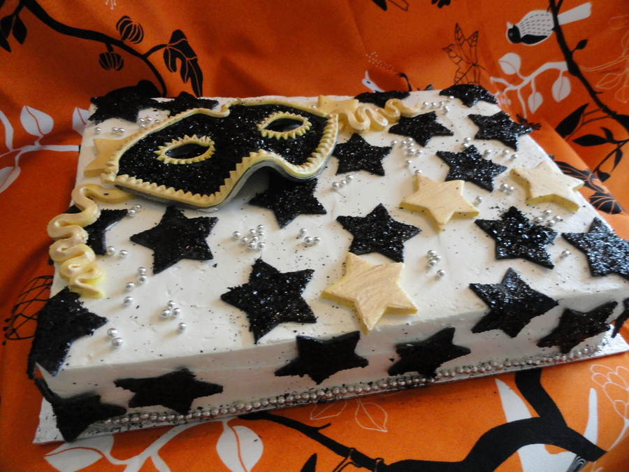 a black and white masquerade cake with gold highlights. The mask is gumpaste covered with edible glitter.