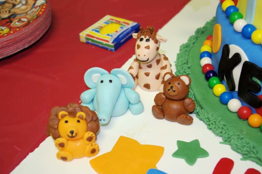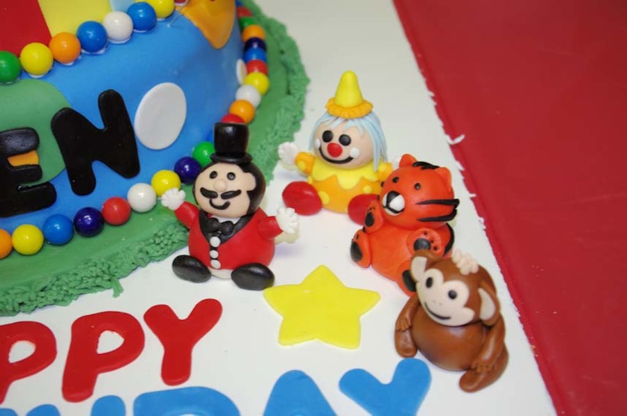 A circus/carnival themed cake. Circus tent is made from cereal treats. Figures and decorations are made from MMF. Tier borders are gumballs.