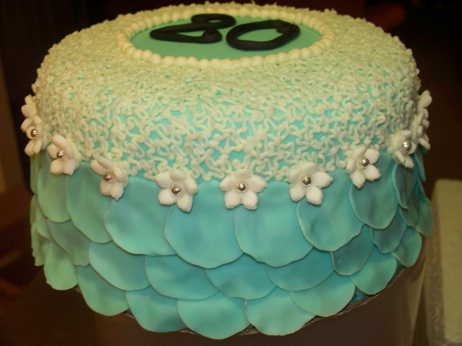 8"round covered in fondant with fondant petals on the side, cornelli lace in buttercream, fondant flowers.