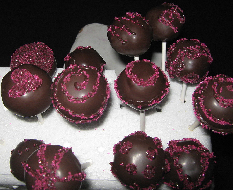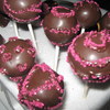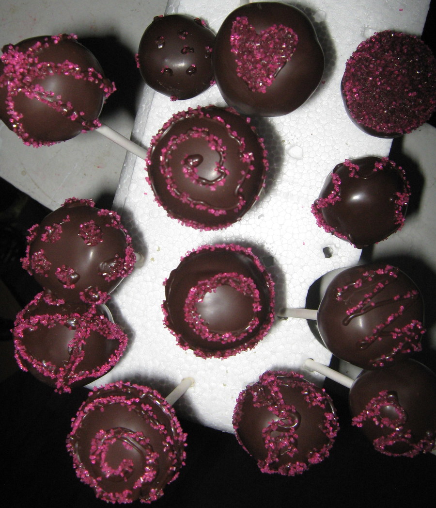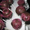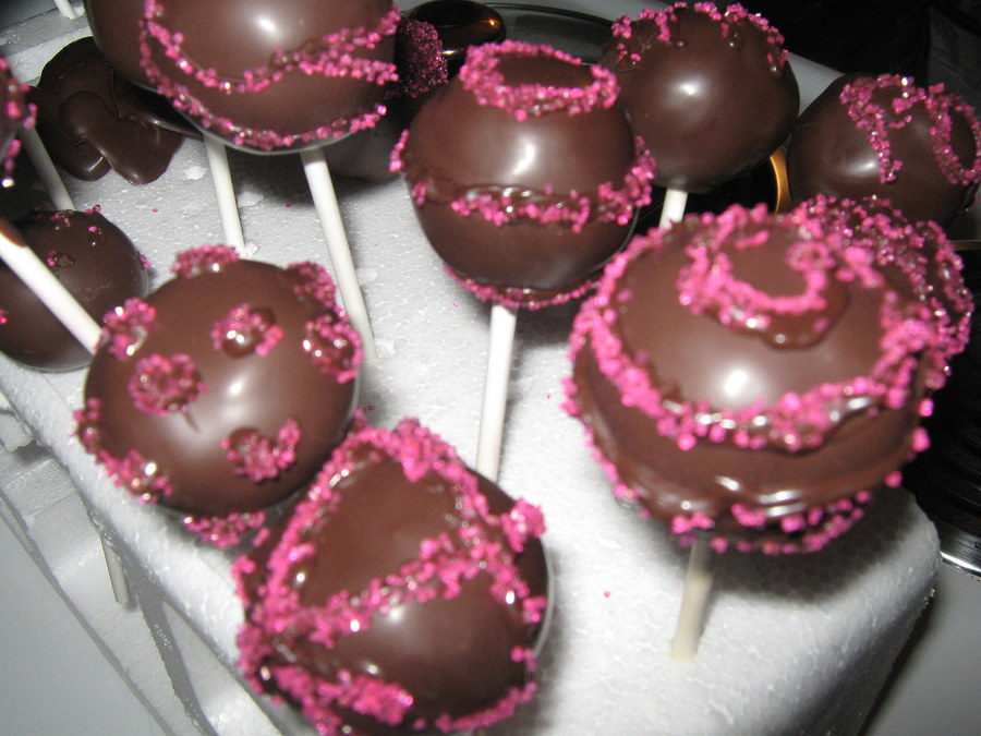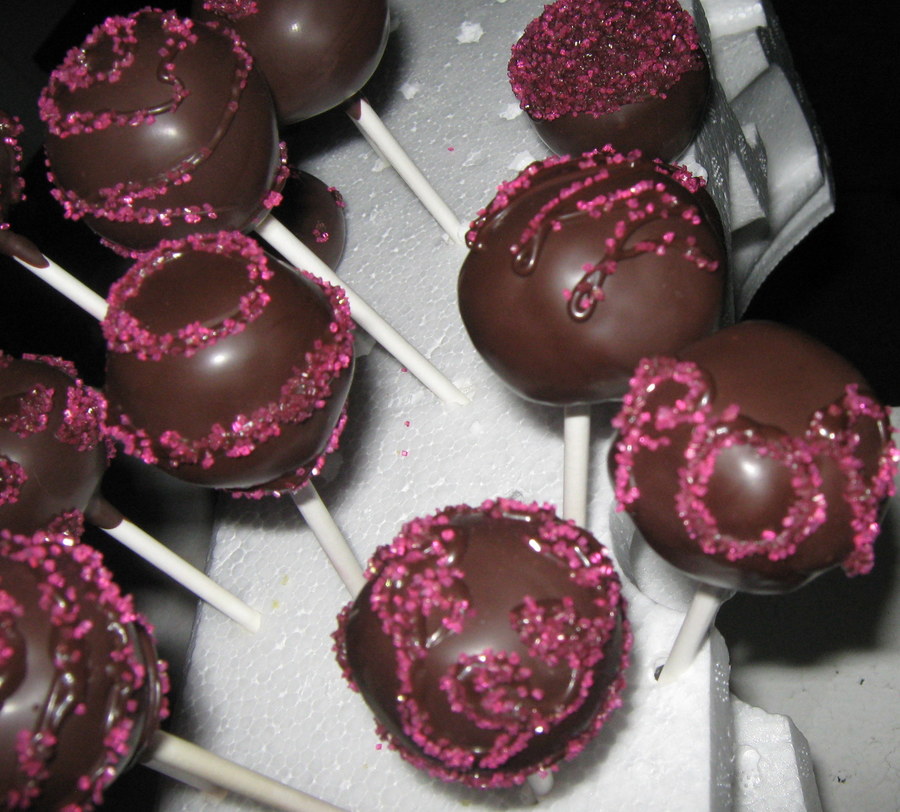Yellow cake with Chocolate frosting, dark chocolate coating, with pink sprinkles!