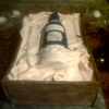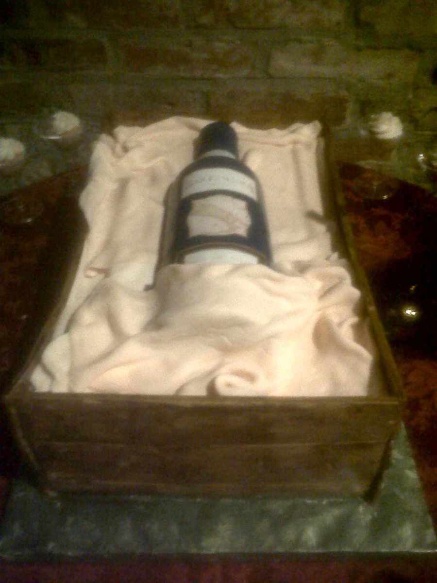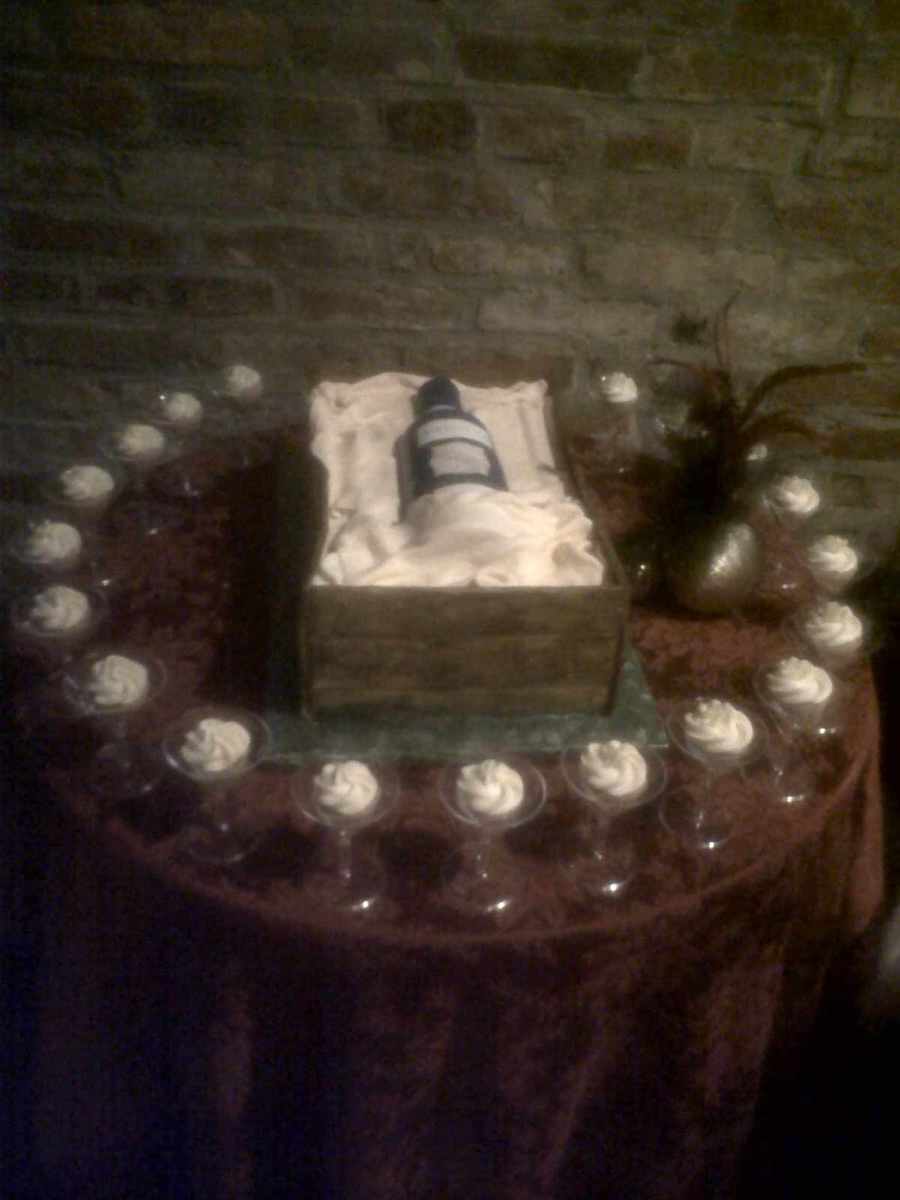 Mascoto! The bottle was made of gumpaste and coated with confectioner's glaze so it could appear glossy like the original bottle, The cake was a strawberries and cream flavored cake with strawberry buttercream icing. It is surrounded with strawberry mini cupcakes in mini martini glasses.