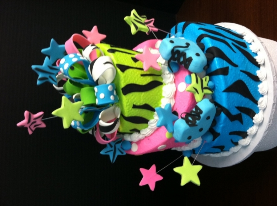 Cake for a skating party; each tier is a different flavor, zebra stripes to top and bottom tiers, polka dots on the middle tier, multi-colored fondant bow; multi-colored fondant stars, skates are made of rice krispy treats and covered in fondant. What a fun cake to put together!!