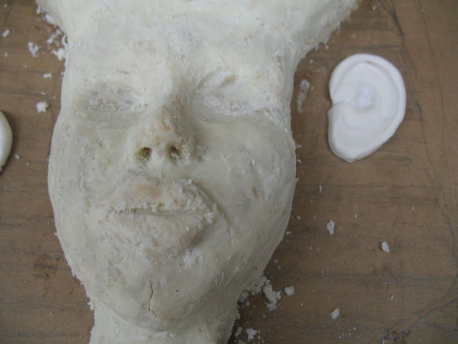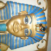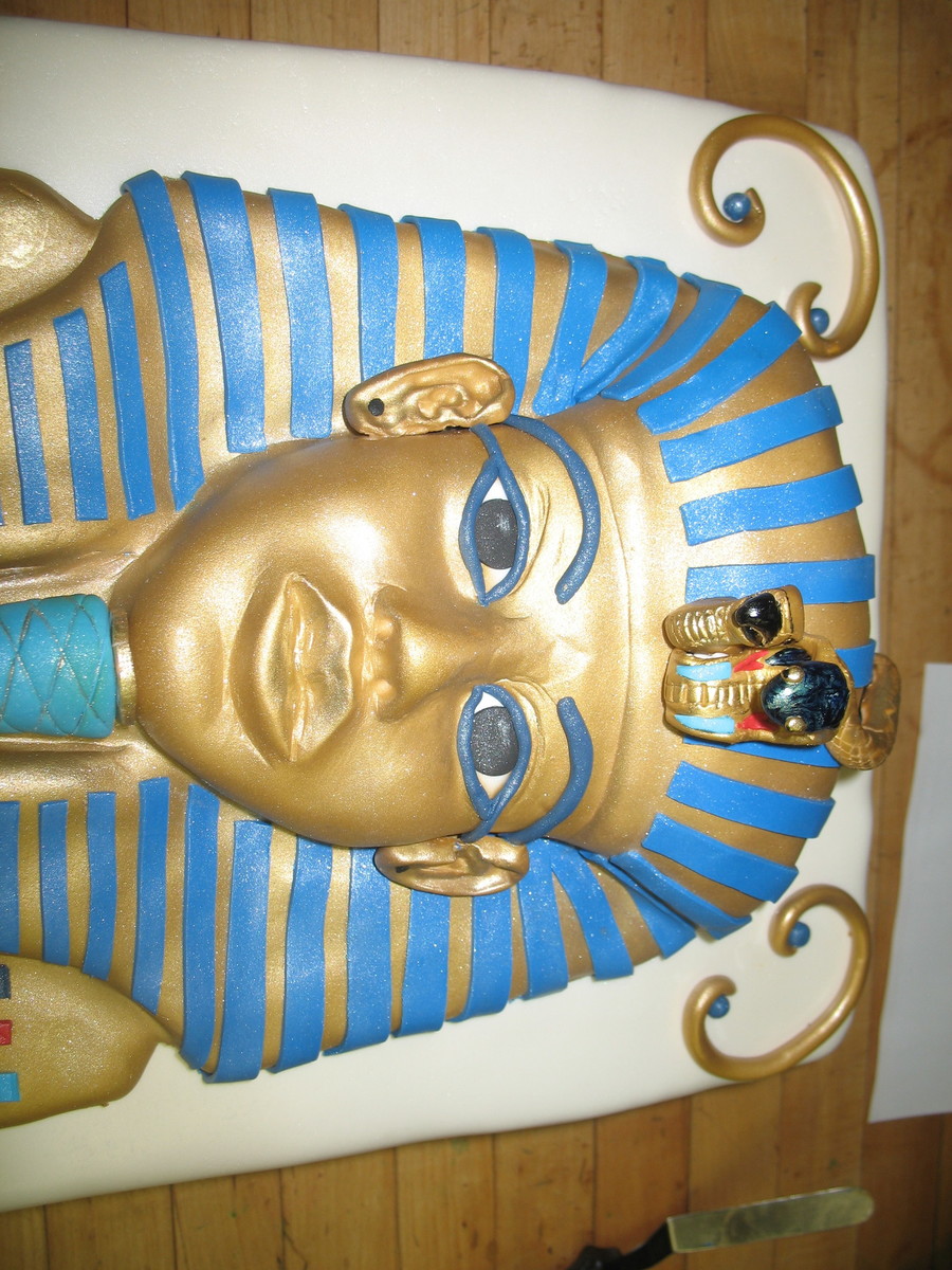 I built up the face with Rice Krispies and white chocolate over them. Gold was the airbrush gold, then the white of the cake is sprayed with pearl luster dust. This was for a 60th Birthday of a Gentleman who loved the whole King Tut era.