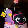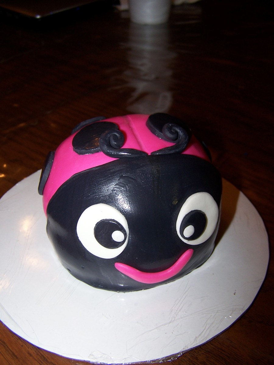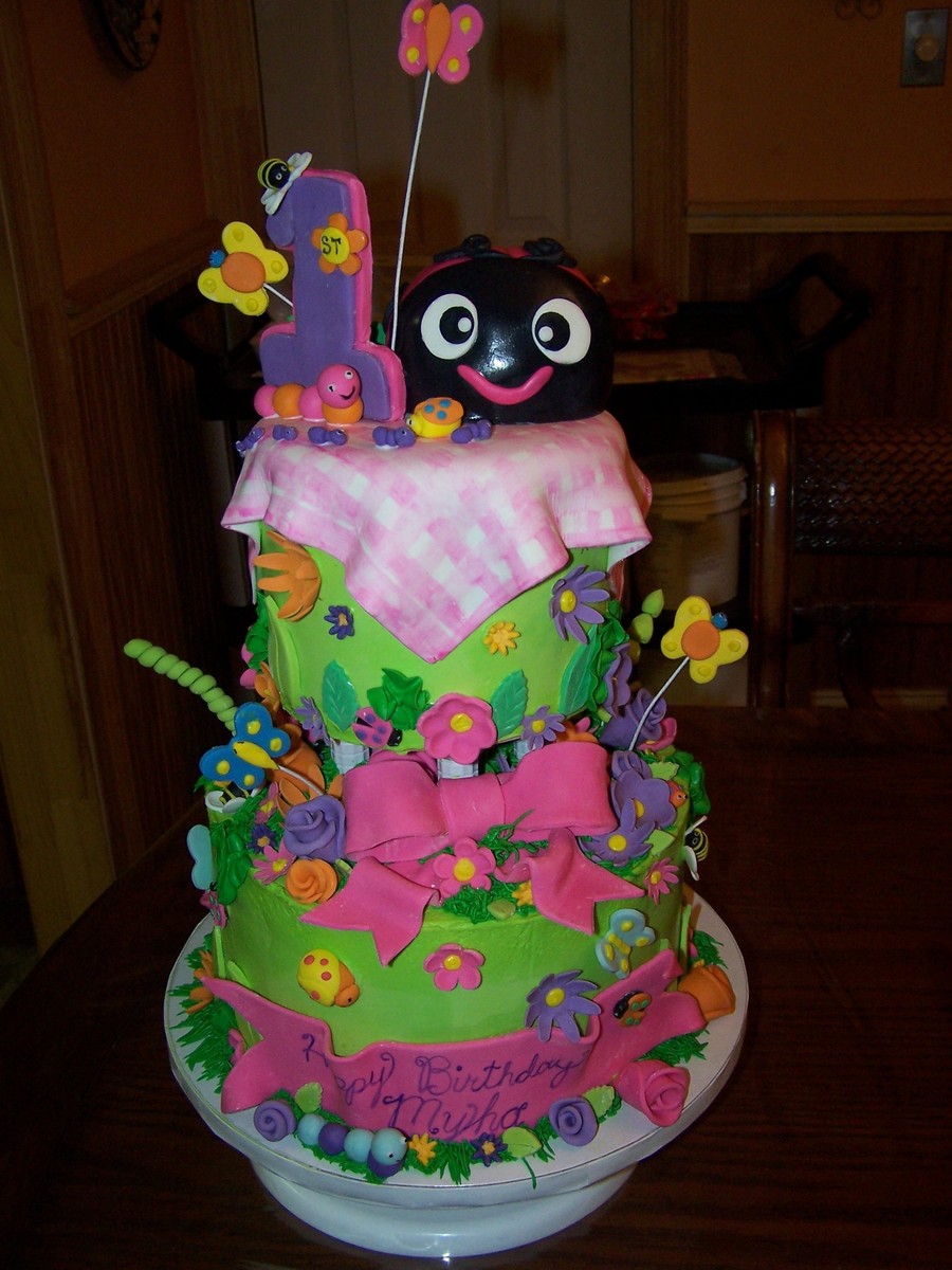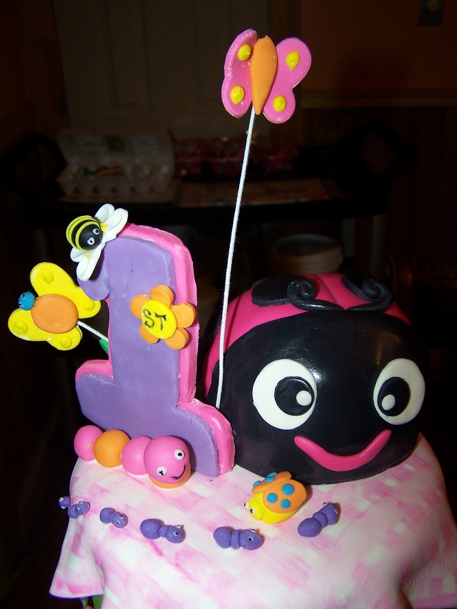 2 tier cake with Lady bug individual Smash cake on top. Vanilla and Chocolate cake with Buttercream icing and fondant figures