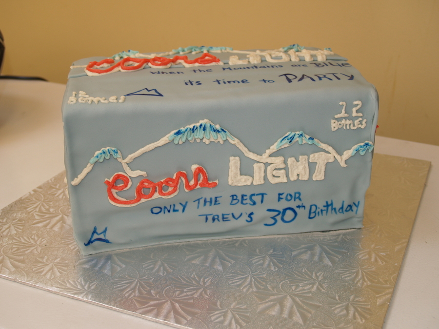 Beer box Birthday cake, 6 layers of chocolate cake w. Irish Cream buttercream, mocha cake with dark chocolate buttercream and french vanilla cap. with french vanilla cap. buttercream. covered in fondant with buttercream accents and painted details