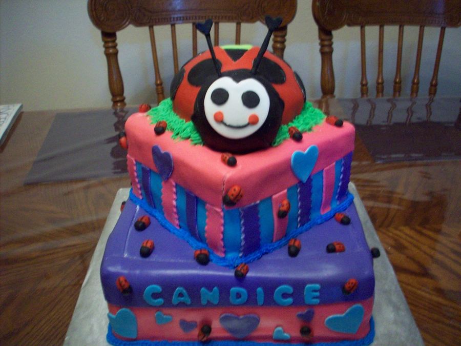 10 square-strawberry/strawberrycheesecakefiling, 8 square-vanilla/vanilla cream filling, ladbug chocolate cake.