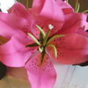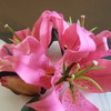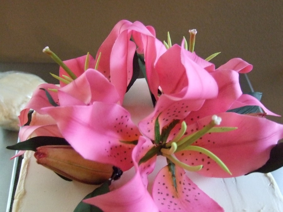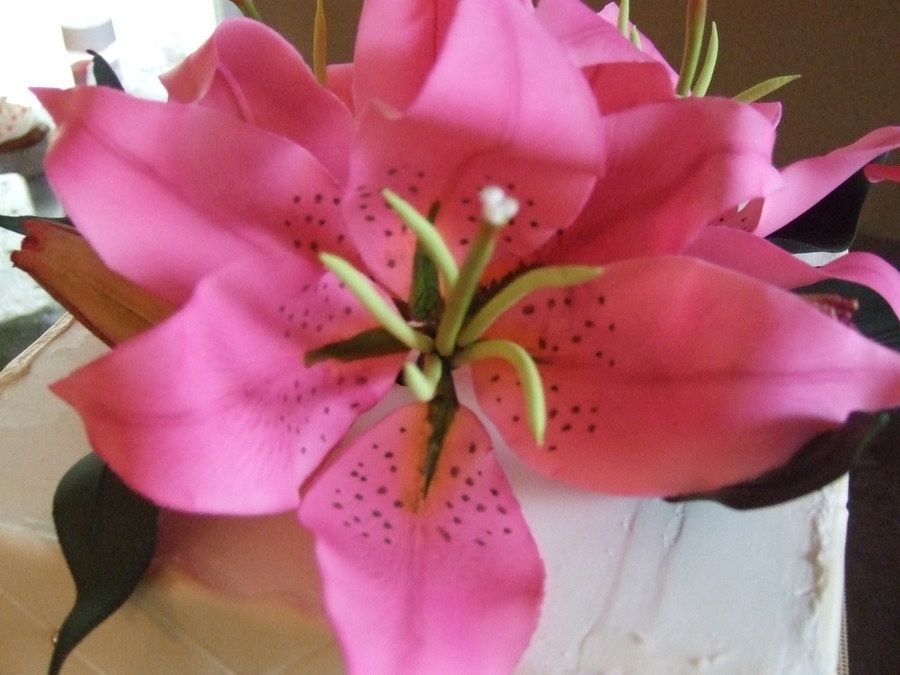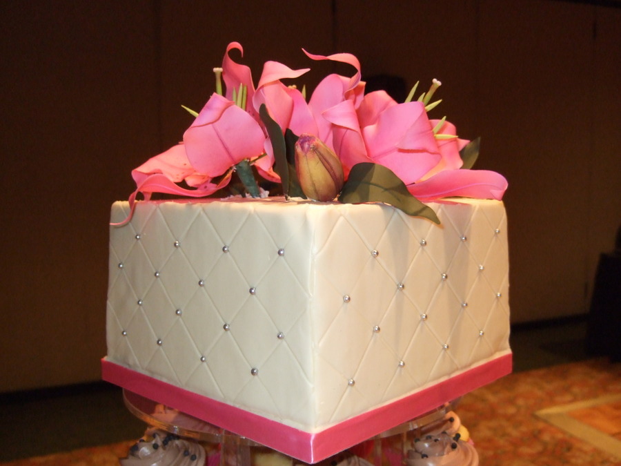 8" square cake, white chocolate panels over butter cream. Pink gumpaste lilies - my first time! Thank goodness for Edna's video! TFL.