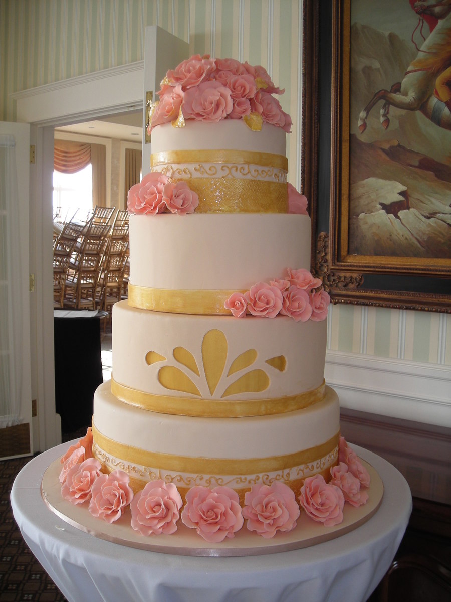 I was asked to make this cake for a charity event to raise money for women with cancer. It has gold detailing with over 50 peach fondant roses and a cut-out detailing inspired by Mary of Cake Girls)