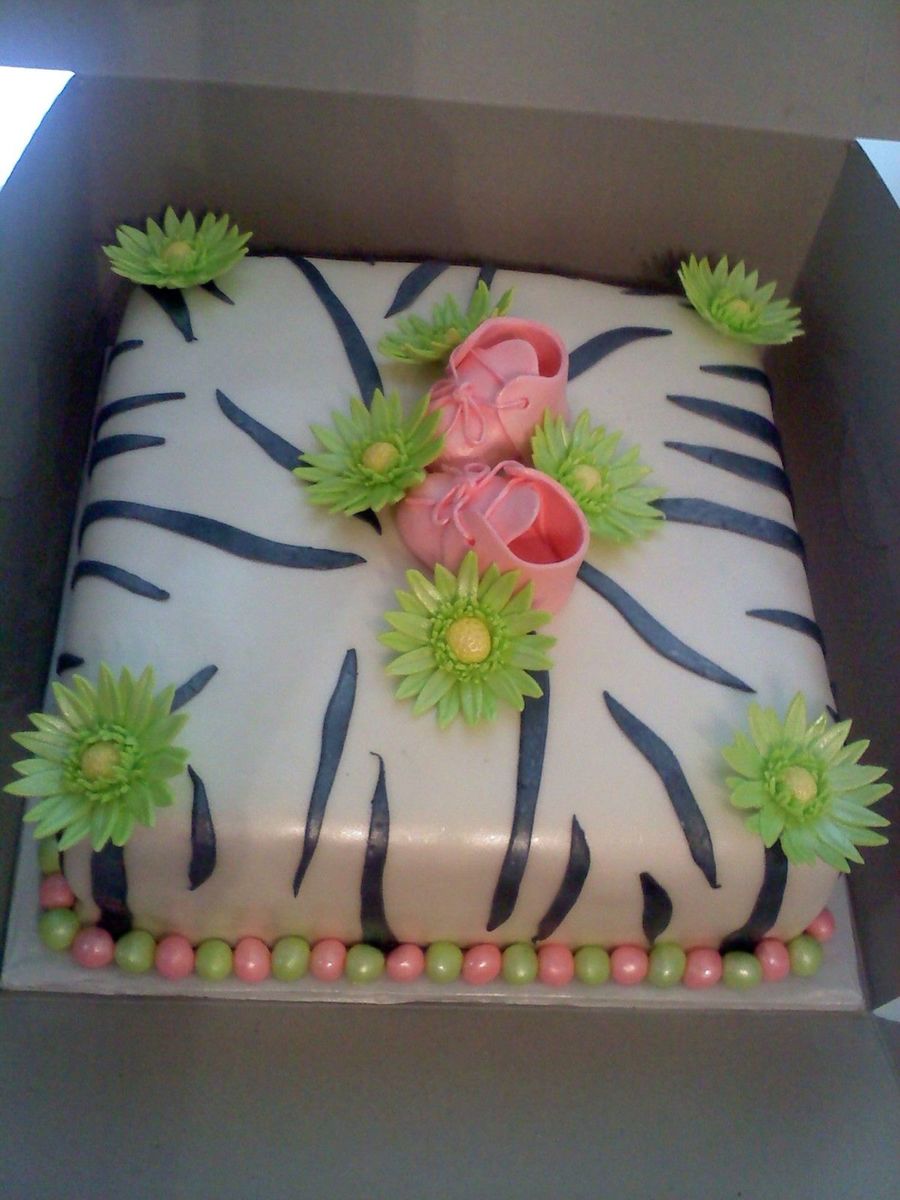 Chocolate Cake with MMF. Gerbera Daisies are made with MMF. Baby Booties are made out of gumpaste. Thanks for looking!