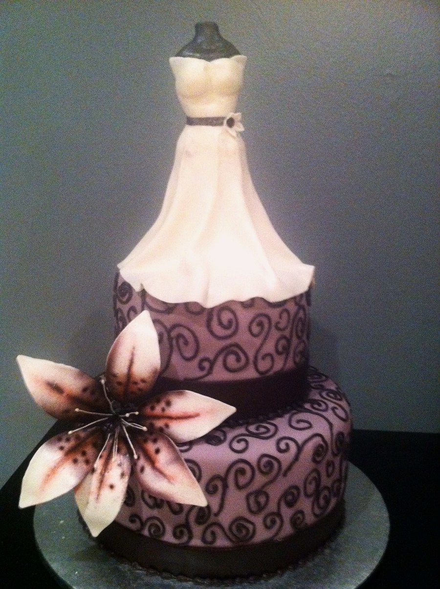 Two tier Bridal shower cake with fondant and buttercream accents, and gumpaste flower.