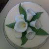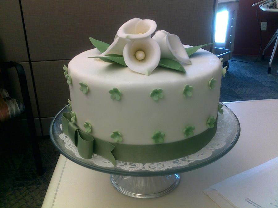 This is a dummy cake I decorated as a sample for a class I'm teaching at my work. The proceeds from the class will go to the local food pantries. Calla lilies, leaves and small flowers are gum-paste and I used regular grosgrain ribbon around the bottom.