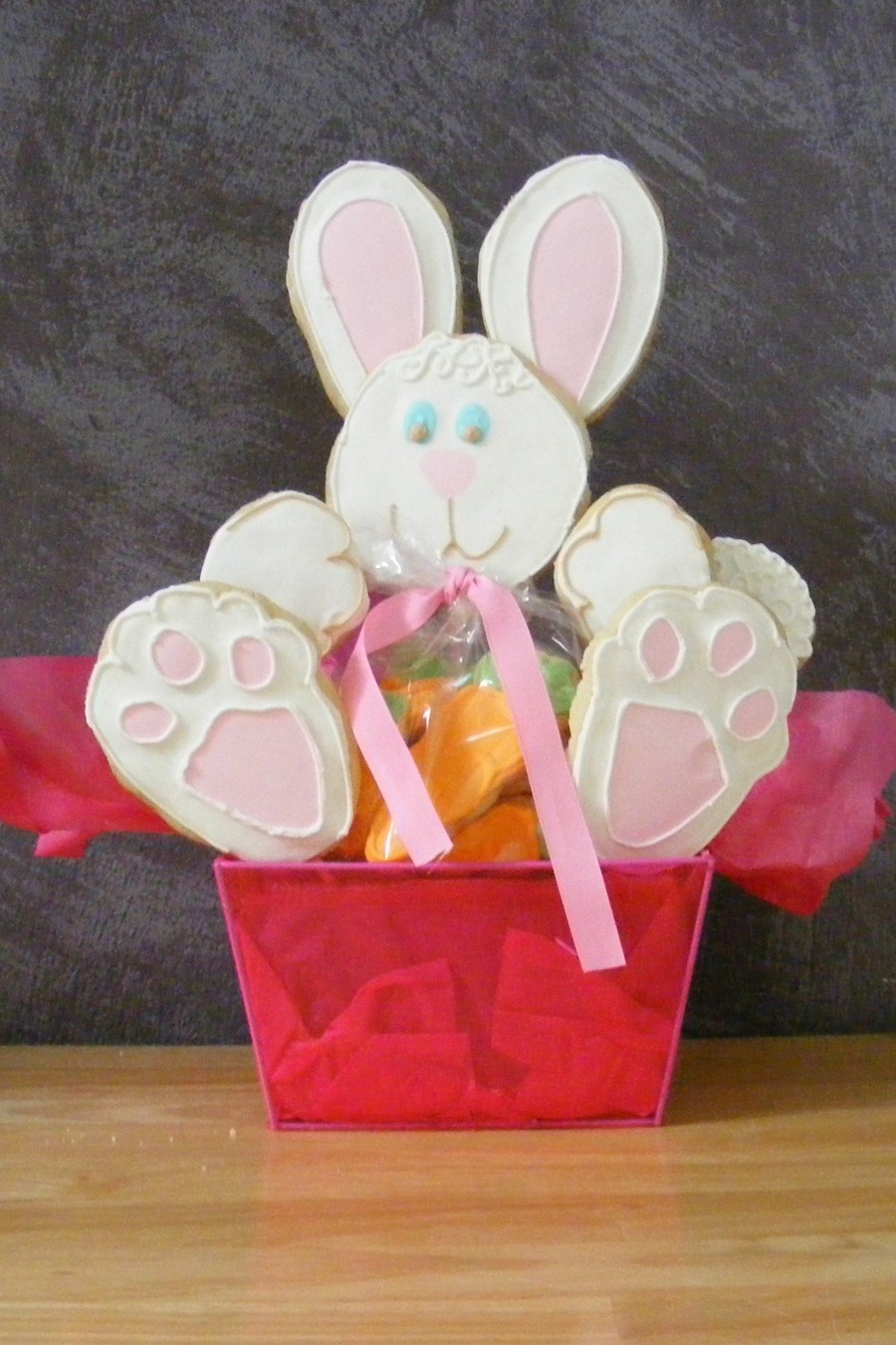 A bunny Easter cookie bouquet, made with NFSCookies. "Carrots" in a bag for the tummy.