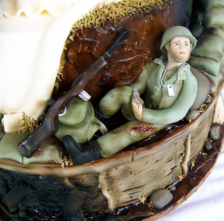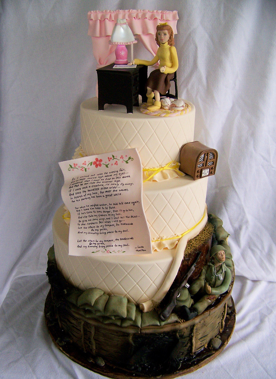 This cake was my entry into "Let Them Eat Cake" in Philadelphia, which is a local wedding cake competition and cake-tasting charity event. 40 pastry chefs compete and almost 1,000 people attended! I did not win anything. *sniff* But my heart was pretty tied up in this couple by the time I finished. The theme was "Historical Romance: Love in Any Age" so my "historical couple" was during World War II.