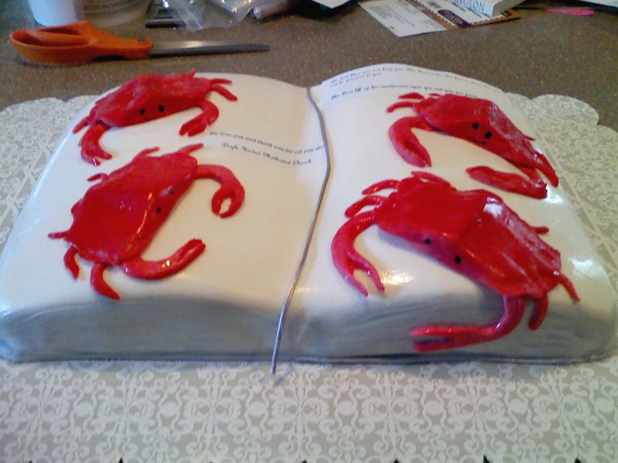 This cake was made for Grammy award winning gospel singer Jason Crabb during our church revival. bible covered with fondant, crabs made from fondant and sprayed with red color mist.