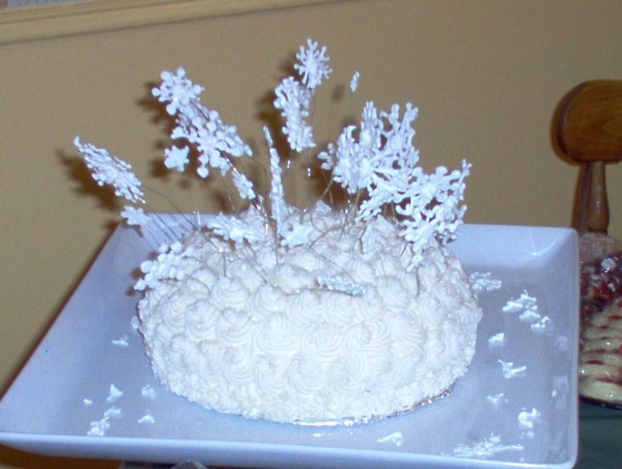 this is a chocolate cake with BC frosting and royal icing snowflakes on wires and lots of glitter