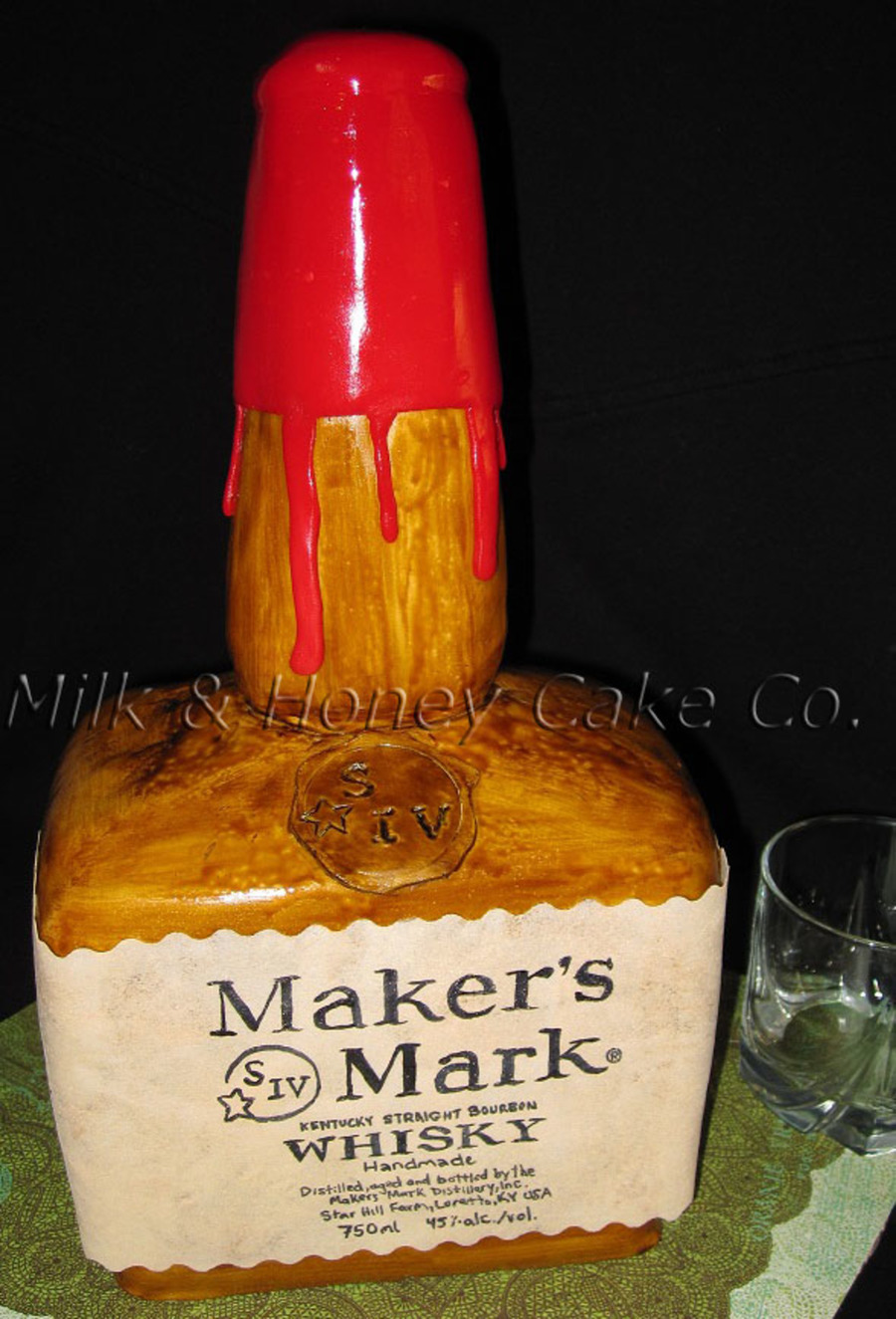This cake was a lot of fun! Body is chocolate cake with ganache, bottle neck is RKT, red wax is candy melts. Label is edible wafer paper petal dusted brownish then painted words with black gel/vodka mixture. Tinier letters are edible marker.