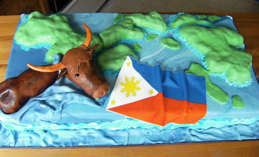 This cake was for a friends son who returned from his mission from the Philippine Islands. They asked for three things. The islands he served in, a water buffalo and a flag. Everything is edible. TFL