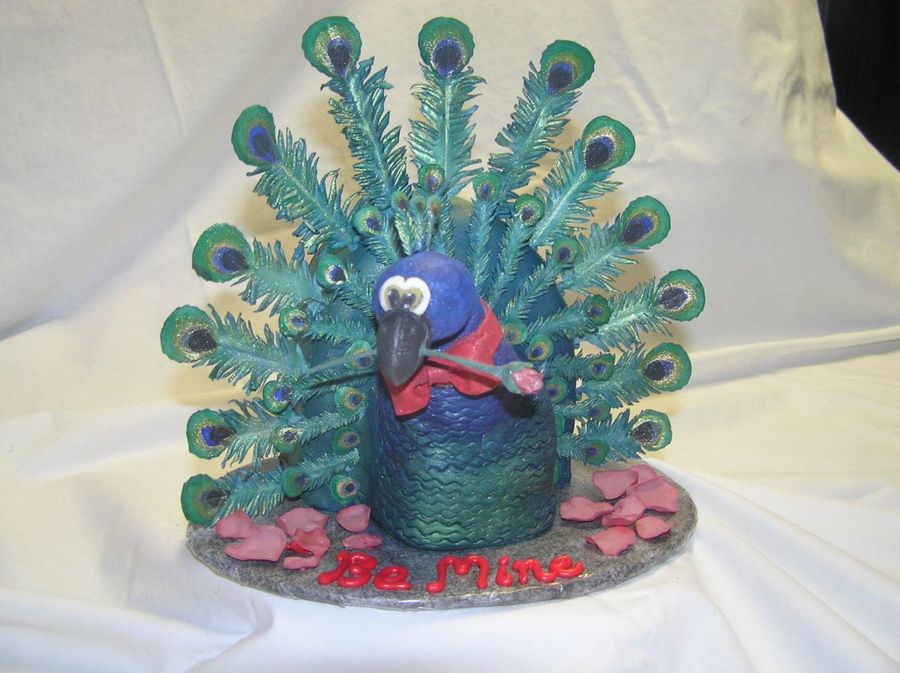 Well I had an idea and here it is............Parading Percy Peacock !!! He is white choc mud cake, with MMF, Feathers are sugarpaste and royal, facial features and rose are sugarpaste. All hand painted. This was so much fun to make!! My son gave it to his girlfriend.