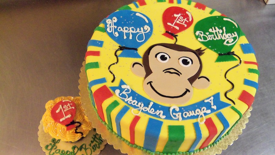 First Birthday Cake to match curious george Party supplies, fiinished with rolled fondant accents.