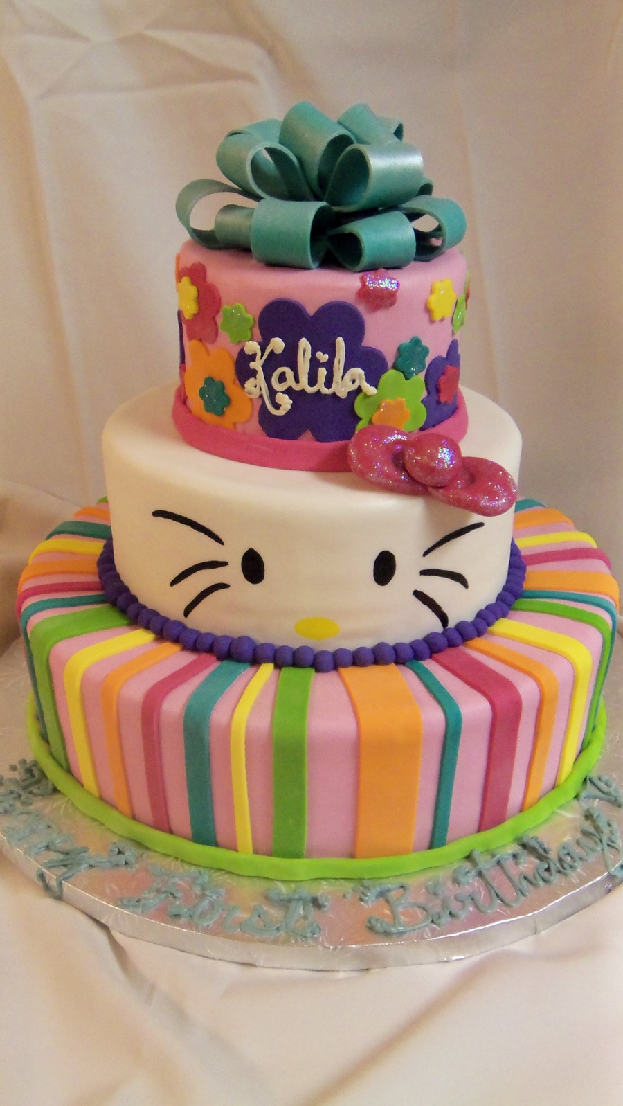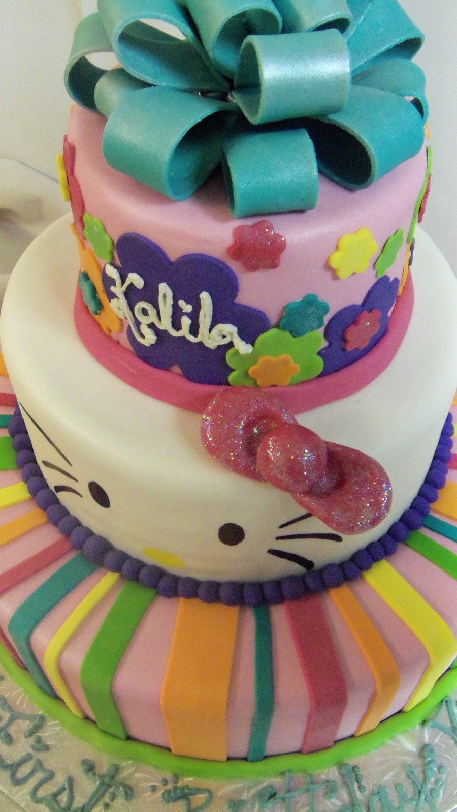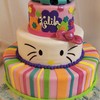 3 Tiered Birthday cake finished with fondant stripes, flowers and bow. Hand painted Hello Kitty Face and sparkle bow.