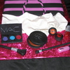 Chocolate cake with Cream Cheese and Raspberry drizzle filling. Covered in fondant. Gumpaste/Fondant make-up. The black compact cracked a little overnight. It was hardly noticable in person. The camera picked it up really well. This cake was a lot of fun! TFL=)