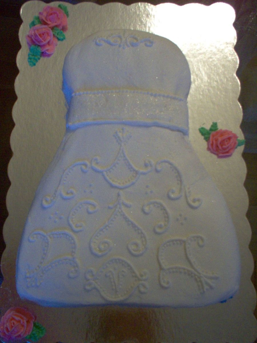 mikaza on 14 Jan 2006 , 11:47pm It is an 11x14 cake, cut into the shape of the dress. It is covered in a crusting frosting.