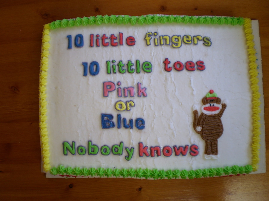 Half sheet cake I did for a girl at work. They weren't going to find out what they were having. The baby's room was primary colors and sock monkeys.