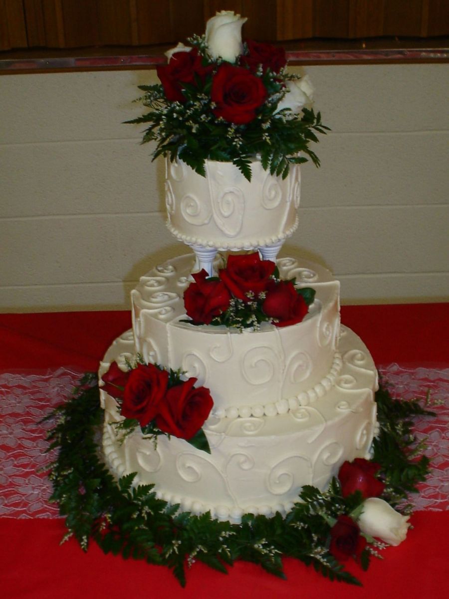 This cake was iced in Mouselline Buttercream (from "The Cake Bible") flavored with Kahlua. I didn't care for the ivory frosting against the stark white pillars though, but I didn't think about that until I was setting the cake up. The sizes were 14", 10" and 6". The flowers were supposed to be all red roses, but the florist threw in a surprise, but I liked the end result.