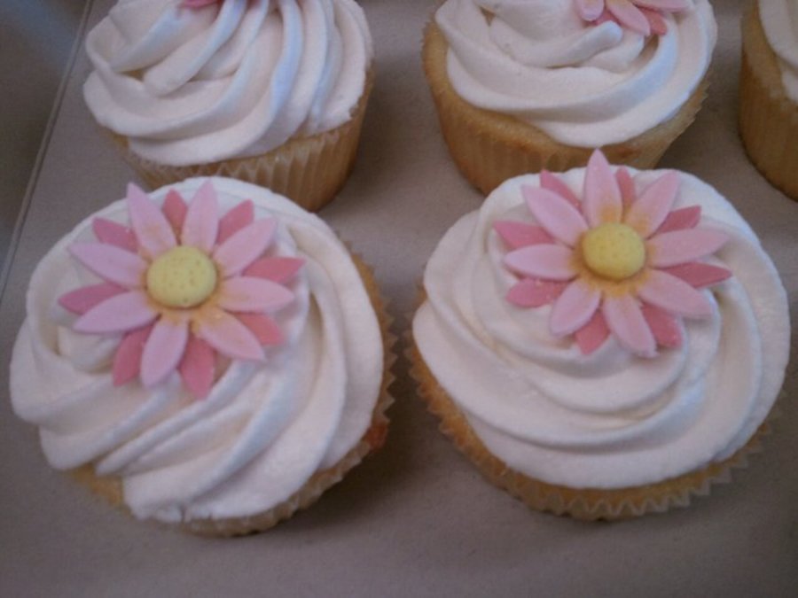 I made these for a luncheon after a funeral. Vanilla cake, with a french vanilla mousse filling, and indydebi's buttercream. Daisies are gumpaste with luster dust.