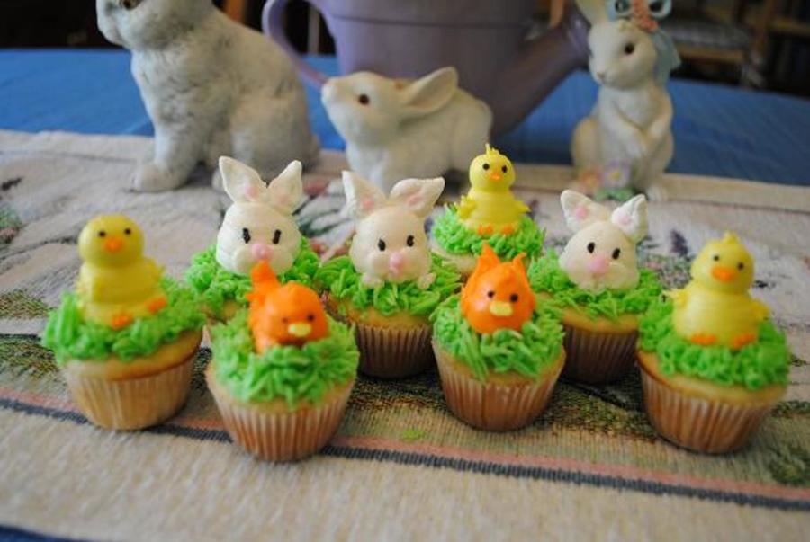 Mini cupcakes, decorated in buttercream bunnies, chicks, and ducks.